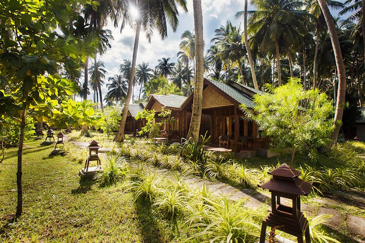 Grass-roof huts and cottages in a sea-view resort with a seafood restaurant, a bar & gardens.